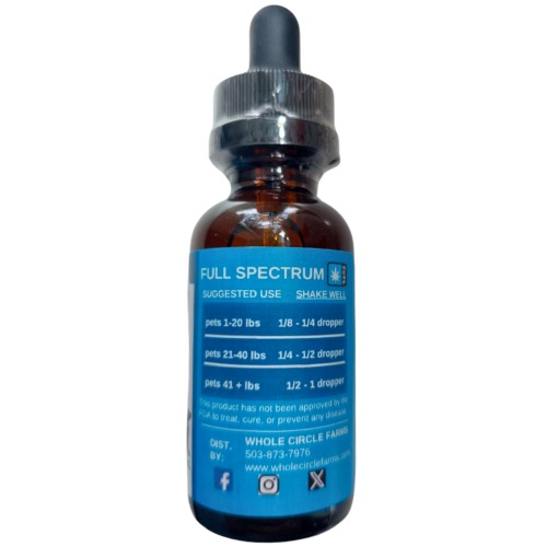 Every pet’s journey with CBD is unique. This tincture is made with fractionated coconut oil and full spectrum organic hemp oil, containing 50 mg of CBD per dropper and 1500 mg per bottle. At Whole Circle Farms, we advocate personal exploration and research with Hemp CBD Tinctures to find the perfect balance for your pet.