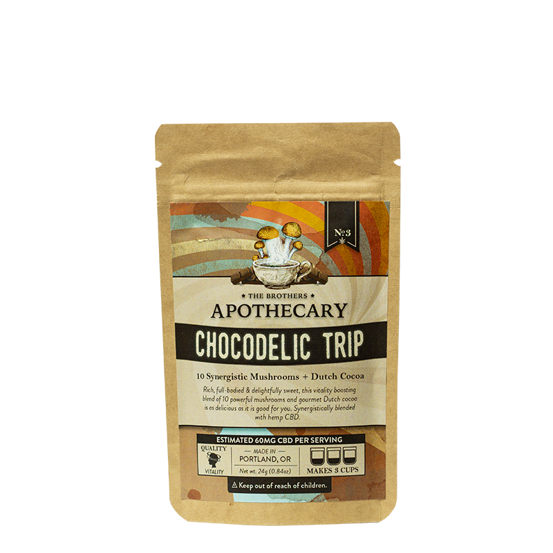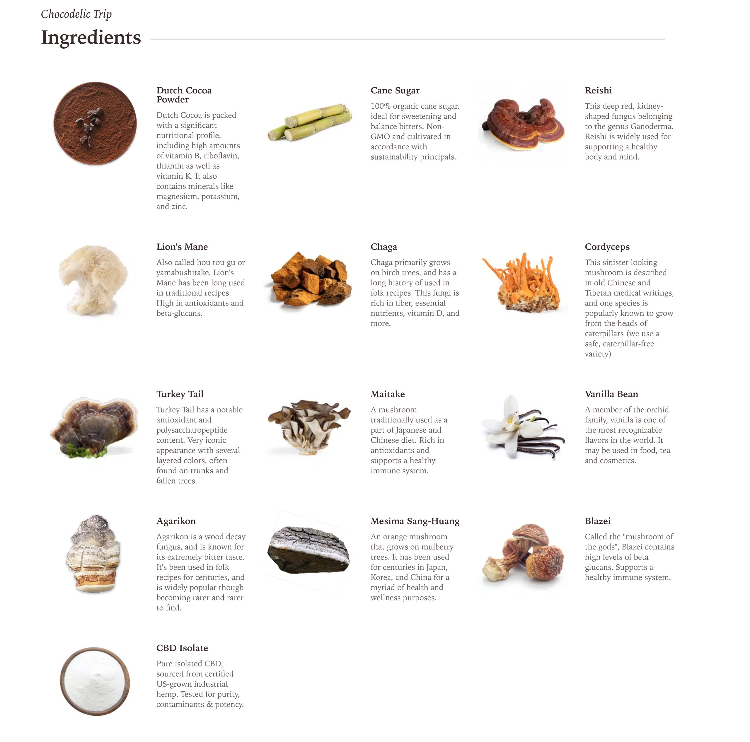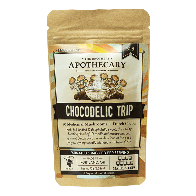 The mushrooms included in Chocodelic Trip are made from finely ground mycelium and fruiting bodies, cultivated on a brown rice base locally here in Portland, Oregon. Each batch is rigorously screened for purity & safety, and these are some of highest quality bioavailable medicinal mushroom products available. The diverse composite of active constituents contained – which includes mushrooms like Chaga, Reishi, and Cordyceps – are an excellent way to support a healthy body, and this rich cocoa is one of the most delicious ways to enjoy them!